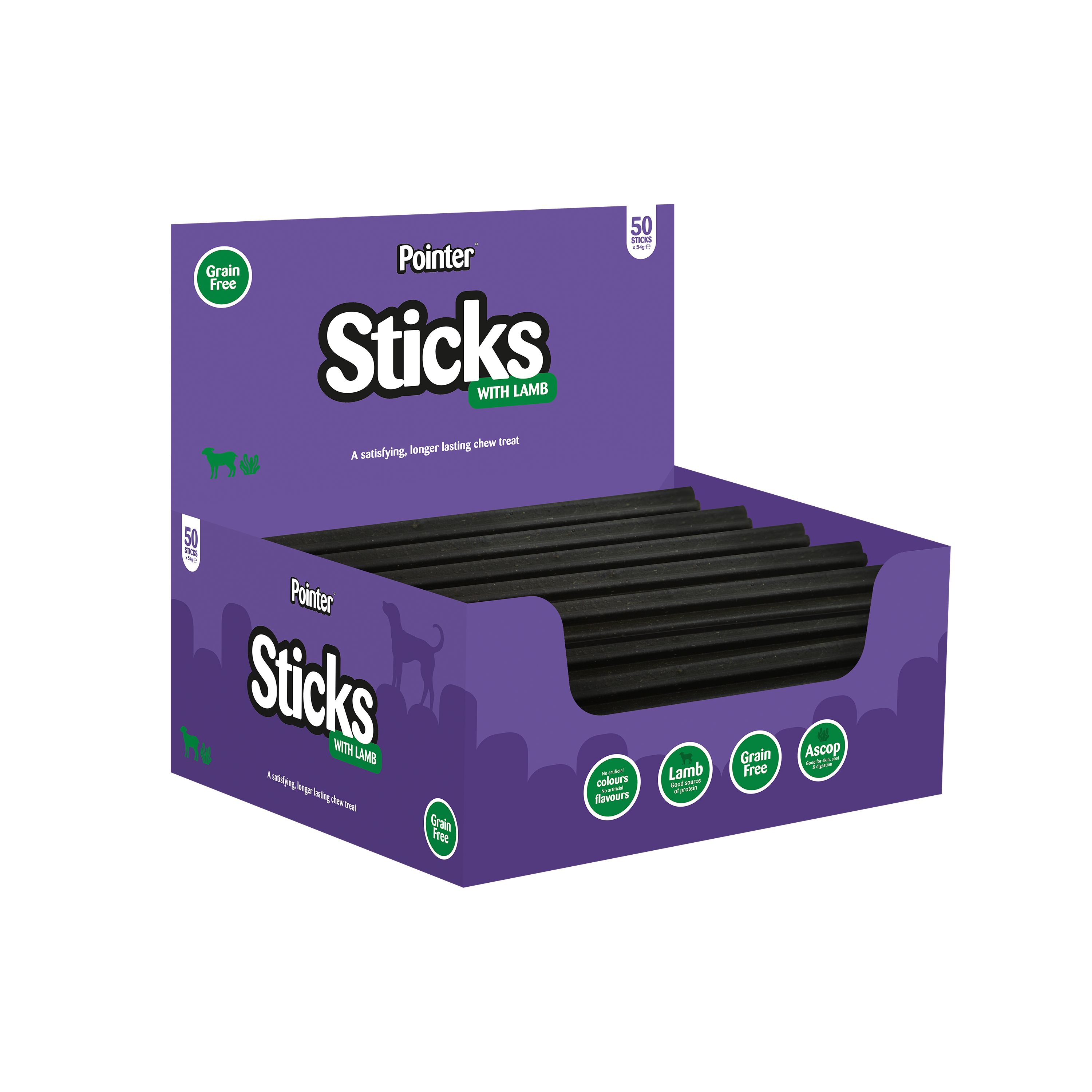 Introducing our new look Pointer sticks with lamb. Now with a grain free recipe with added Ascop (seaweed) and Peppermint in a new and improved shape. Our longer lasting chews are a great way to remove plaque and keep teeth clean while being delicious too.